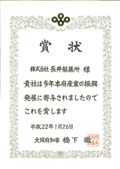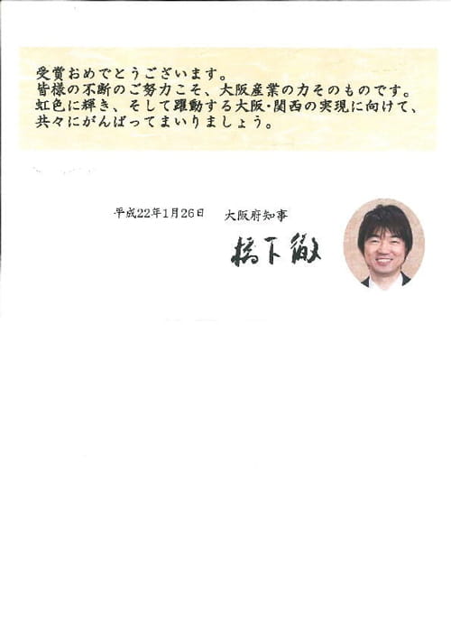 そのうち製造業関係事業所11社のうちの1社として表彰されたことは大変喜ばしく、今後も大阪の産業振興のために貢献していきたい所存です。